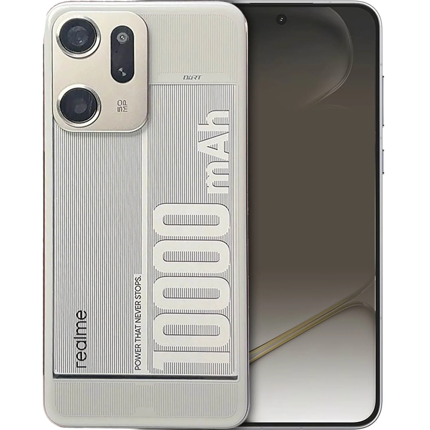 Mặt lưng được in dòng chữ "10000mAh", làm nổi bật dung lượng pin siêu khủng. Mặc dù dung lượng pin lớn, điện thoại chỉ nặng 212 gam và dày chỉ 8,5 mm, cực kỳ nhẹ. Điều này cho thấy Realme GT 10000mAh có thể đáp ứng nhu cầu của mọi người dùng.